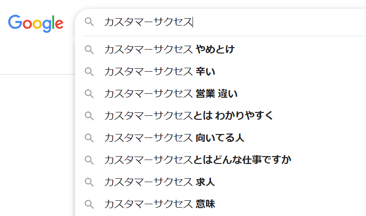 たとえば、googleで「カスタマーサクセス」と検索すると、なかなか辛いサジェスト・キーワードが表示されます。
