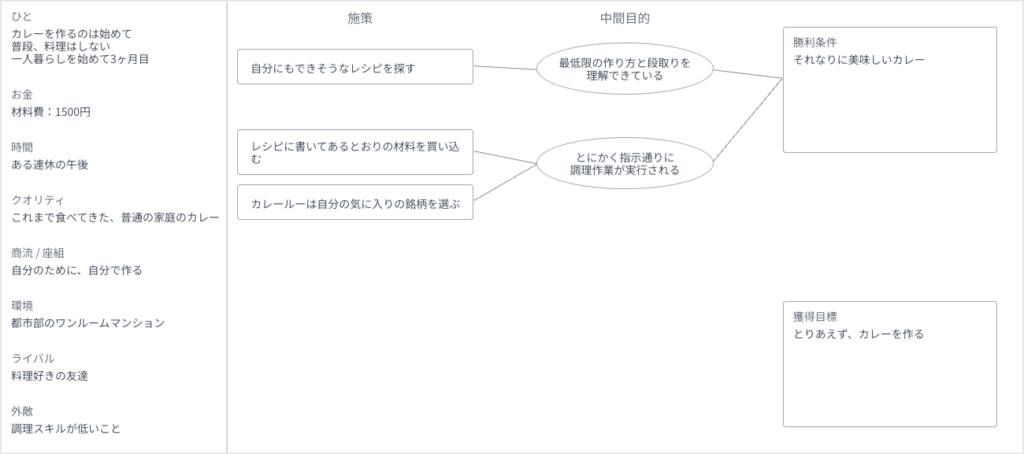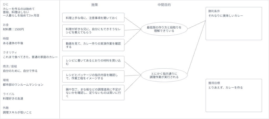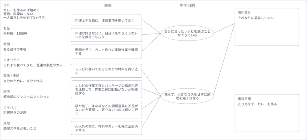 では、ミスをしないように、施策を増やしてみたらどうでしょうか。下のプ譜は、廟算八要素と中間目的を変えずに、施策だけを改善、追加しています。