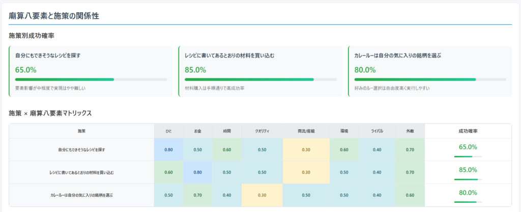 「自分にもできそうなレシピを探す」の施策が成功確率65%と、やや厳しく見られています。