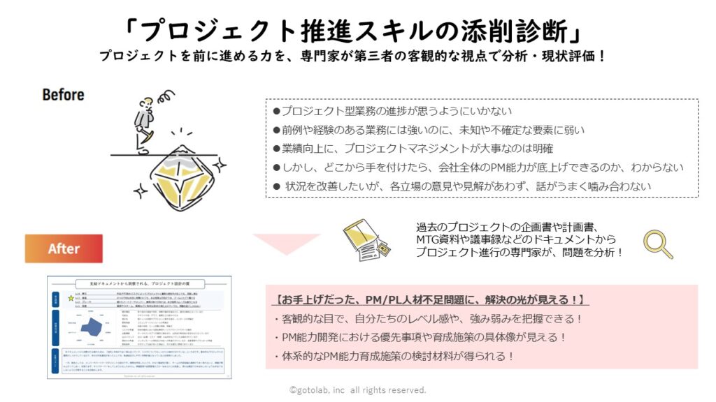 ゴトーラボでは、プロジェクトの企画書や計画書、MTG資料や議事録から、プロジェクト組織や進行に関する深層課題を読み解き、今後、どのような対策を打つとよいかのヒントを差し上げる、というサービスを提供しています。